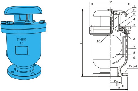 當(dāng)水進(jìn)入管道時(shí),塞頭停在定浮球上部,進(jìn)行大量排氣,當(dāng)空氣排完時(shí),水入閥內(nèi)把球浮起,傳動(dòng)塞頭到關(guān)閉,停止排氣。管道在正常運(yùn)轉(zhuǎn)時(shí)自然會(huì)產(chǎn)生少量氣體,這些氣體全聚集到管道上部,到相當(dāng)程度,閥內(nèi)水位下降,浮球順?biāo)陆禋怏w從小孔排出。如出現(xiàn)停電、停泵,管內(nèi)水流空時(shí)隨時(shí)會(huì)出現(xiàn)負(fù)壓,浮球順?biāo)陆?,打開小孔帶動(dòng)大孔進(jìn)行大量進(jìn)氣確保管道安全。