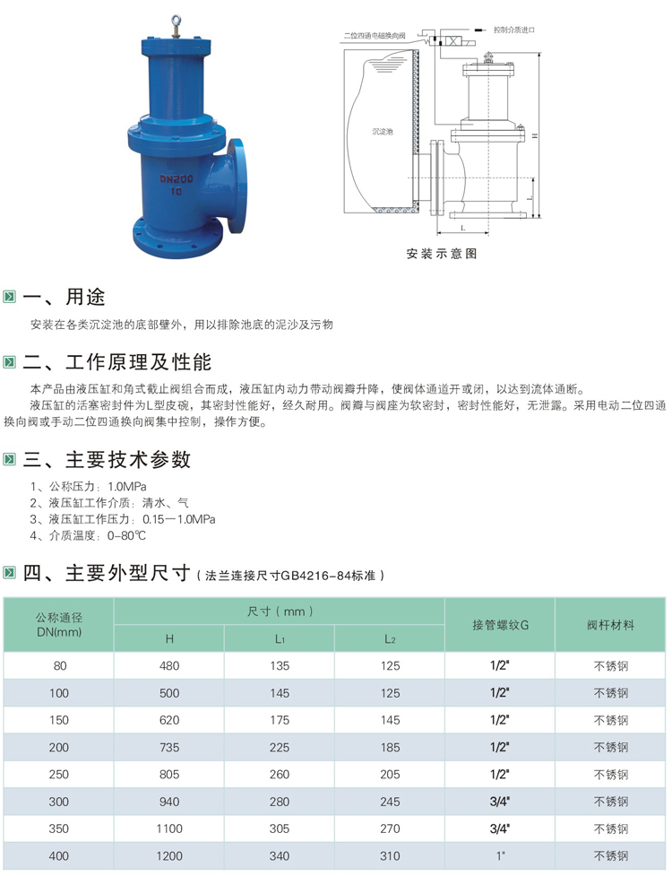 液壓、氣動角式快開排泥閥,是一種由液壓源或氣動源作執(zhí)行機(jī)構(gòu)的角型截止類閥門。通常成排安裝在沉淀池底部外側(cè)壁,用以排除池底沉淀的泥砂和污物。該閥液壓缸之活塞為L形皮碗,密封性能好,經(jīng)久耐用,閥門密封副亦為橡膠密封,無泄漏。還可通過電動二位四通換向電磁閥實(shí)現(xiàn)遠(yuǎn)程控制。操作方便,安全可靠。液壓角式快開排泥閥,氣動角式快開排泥閥,角式快開排泥閥。