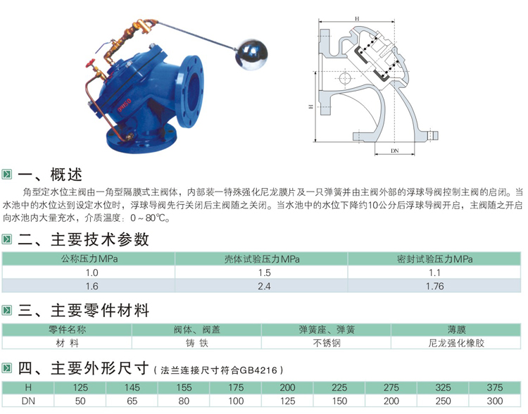 角型定水位閥,是一種隔膜式調(diào)節(jié)水箱和水塔液面高度的閥門。閥門由一特殊強化尼龍膜片將其分為上下兩個腔室,當(dāng)液面達到設(shè)定位置時,浮球?qū)чy關(guān)閉,上腔壓力大于下腔,閥門關(guān)閉,即停止供水.當(dāng)液面下降超過預(yù)設(shè)位置,浮球?qū)чy開啟,上腔壓力小于下腔壓力,閥門開啟.閥門向池內(nèi)供水。角型定水位閥安裝方便,可省去管道彎頭,節(jié)省安裝空間。該閥保養(yǎng)簡單、靈活耐用、液位控制準(zhǔn)確度高,水位不受水壓干擾且關(guān)閉緊密不漏水,性能可靠、成本低。浮球可隨水池的高度和距離安裝。